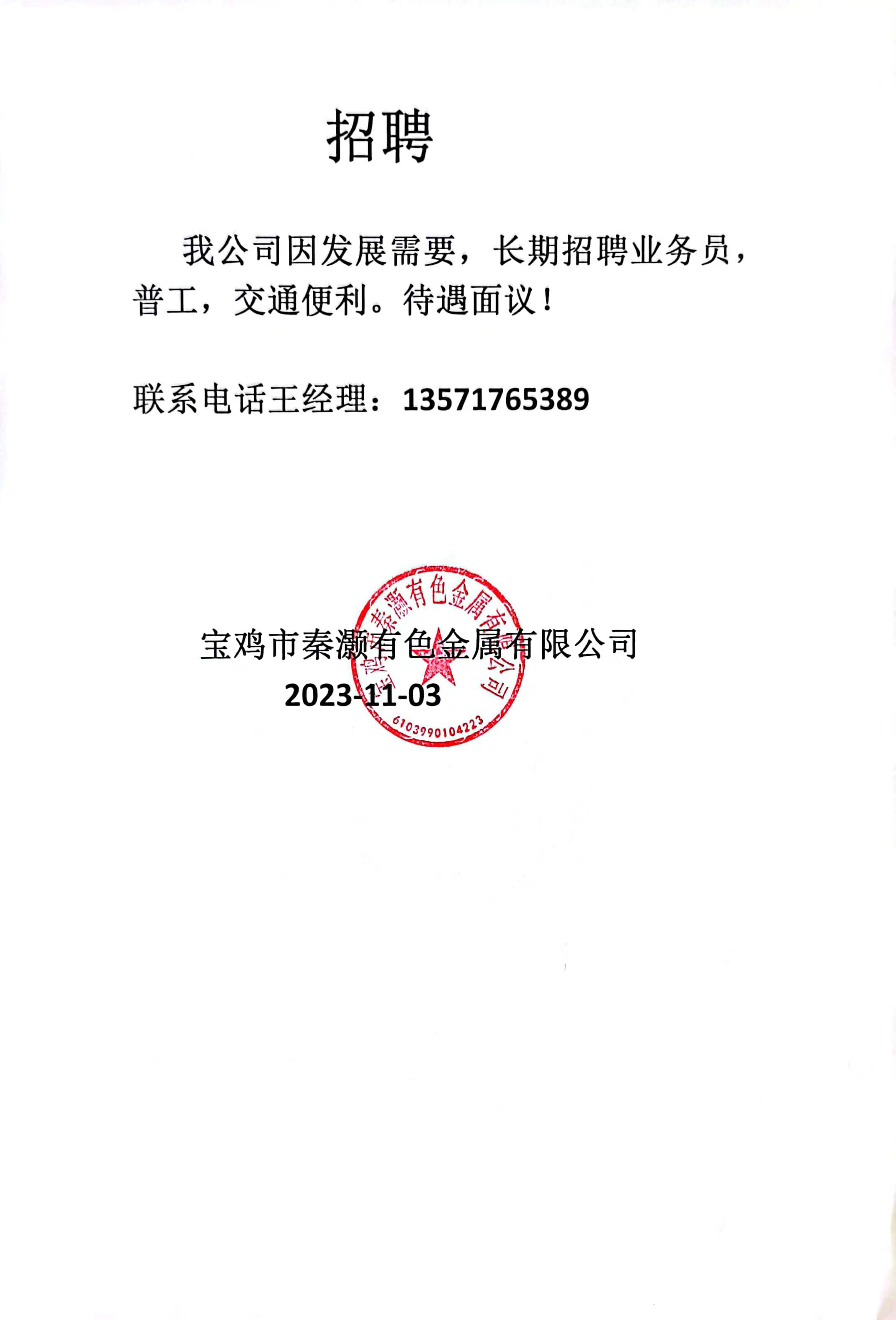 因公司發展需要,長期招聘業務,普工,交通便利!